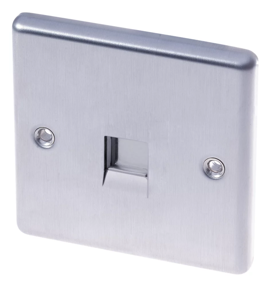 Brushed stainless steel slave telephone socket with shutter and integral moisture protection gasket.