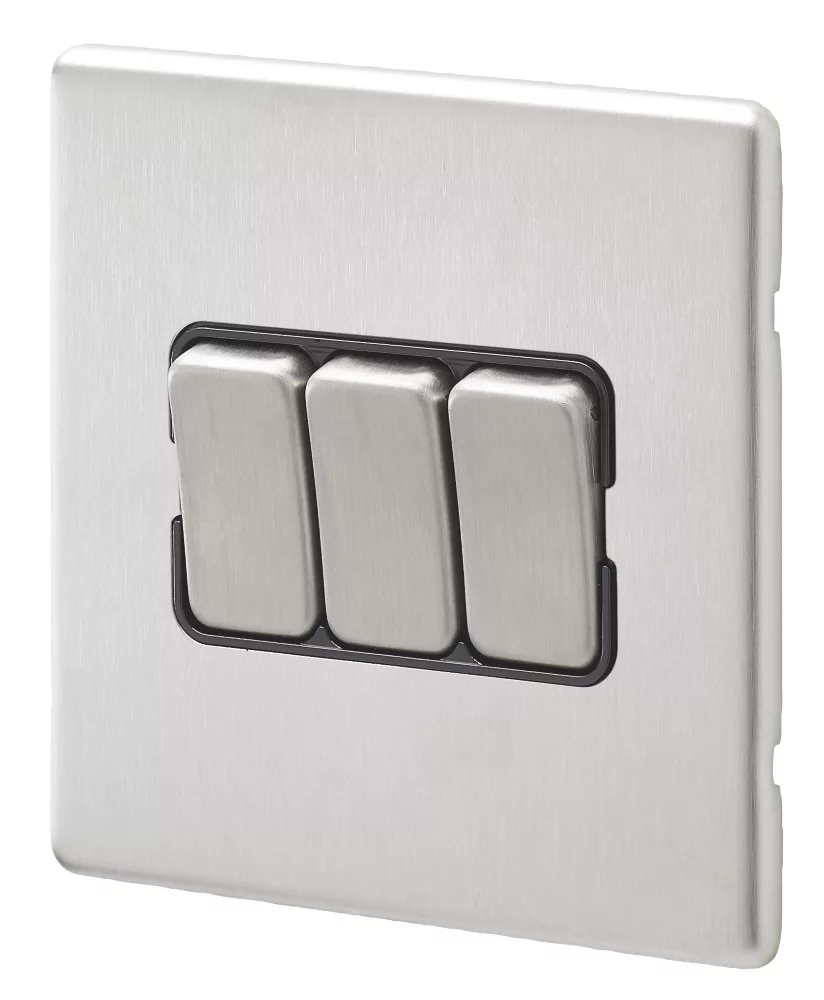 Contemporary switch with slim profile. Upward facing terminals with backed-out and captive screws for easy installation.