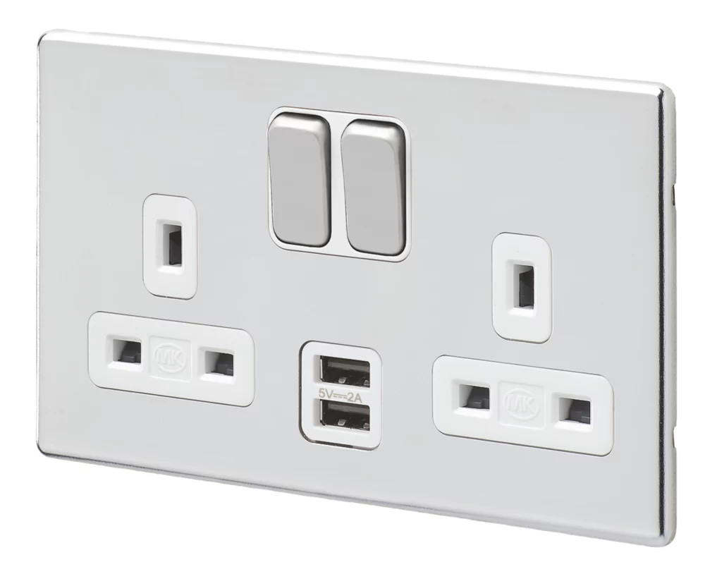 Contemporary switched socket with 2 USB ports. Upwards facing terminals with backed-out and captive screws for easy installation. Dynamic device recognition means the socket can detect different charging requirements and react accordingly for optimal charging efficiency. USB is protected against overload or short-circuit. 3-pin child-resistant shutter system is designed to inhibit access to the electricity supply unless all 3 pins are in position.