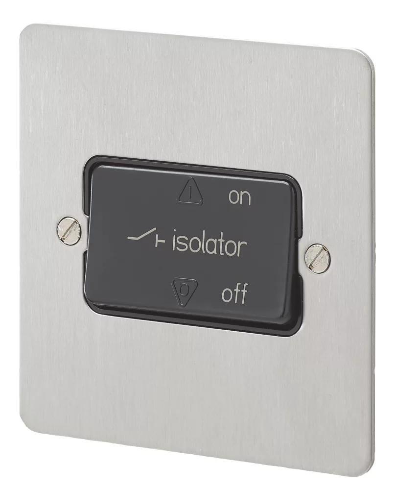 Contemporary 3-pole fan isolator with slim profile. Upward facing terminal with backed out, captive terminal screws. To allow adequate wiring space, mounting box must be installed 6-10mm sub-flush to the wall surface.