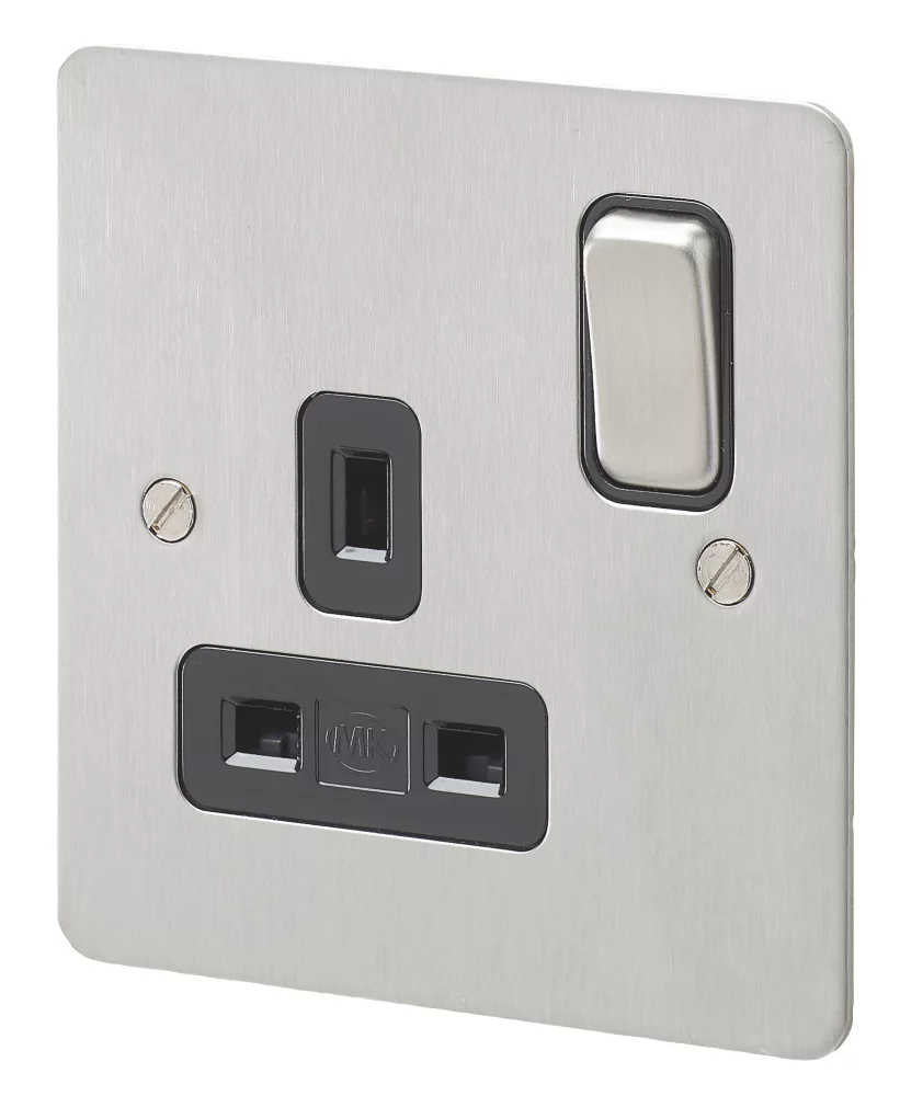 Slim switched socket with upward facing terminals with backed out and captive screws for easy installation.