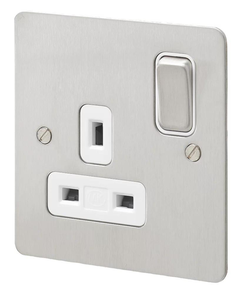 Slim switched socket with upward facing terminals with backed out and captive screws for easy installation.