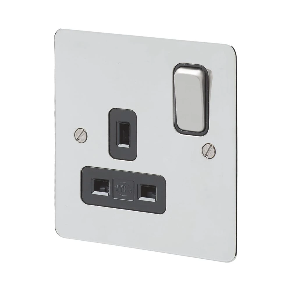 MK Edge 13A 1-Gang DP Switched Plug Socket Polished Chrome With Black Inserts