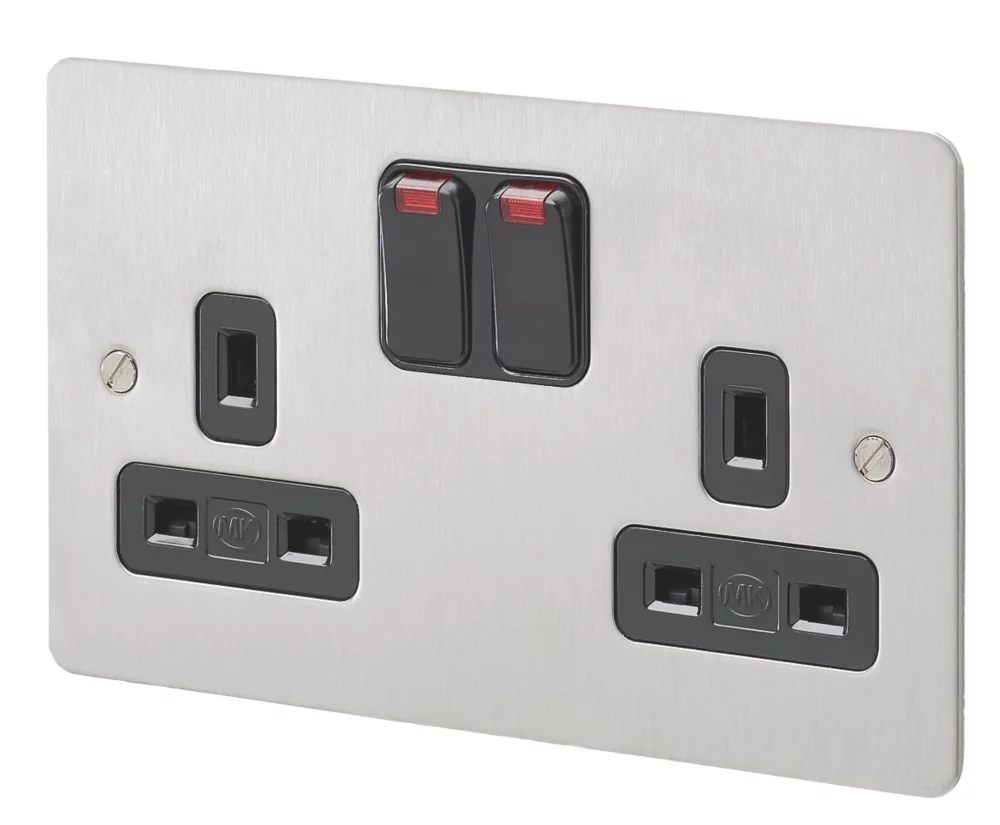 Slim switched socket with upward facing terminals with backed out and captive screws for easy installation.