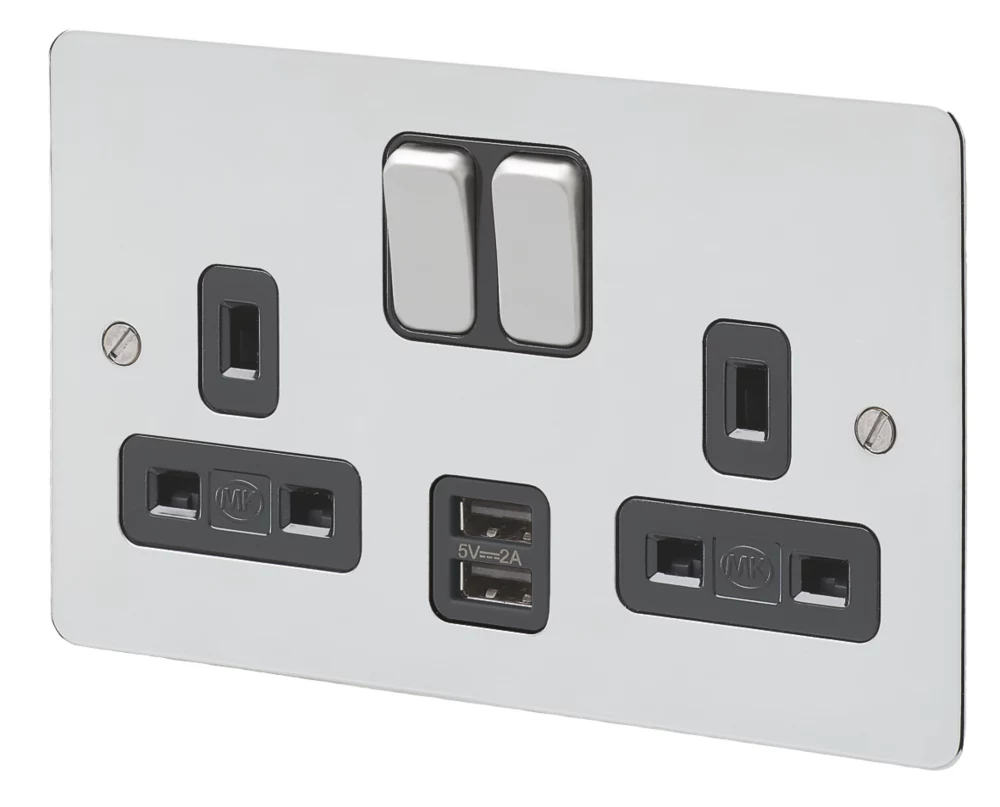 Contemporary switched socket with 2 USB ports. Upwards facing terminals with backed-out and captive screws for easy installation. Dynamic device recognition means the socket can detect different charging requirements and react accordingly for optimal charging efficiency. USB is protected against overload or short-circuit. 3-pin child-resistant shutter system is designed to inhibit access to the electricity supply unless all 3 pins are in position.