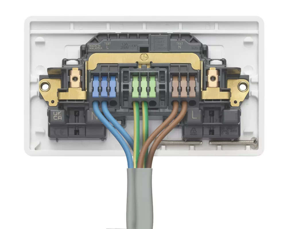 Makes wiring a socket faster, easier and safer through the adoption of screwless terminals. Features spring-loaded terminal clamps to ensure no loose wires for a safer connection. Individual terminal entry points, each accepting 4mm² rigid (solid or stranded) cable. Colour-coded terminal levers to match cable housing for additional safety and installation ease. Cable strip length ruler. Fits into a 25mm back box.