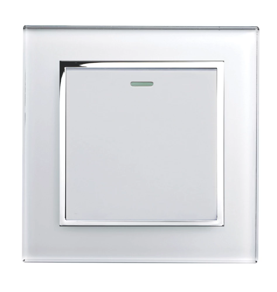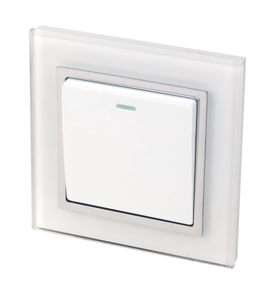 Modern, glass design, mechanical rocker light switch with chrome trim, concealed screws and tru white glass finish.