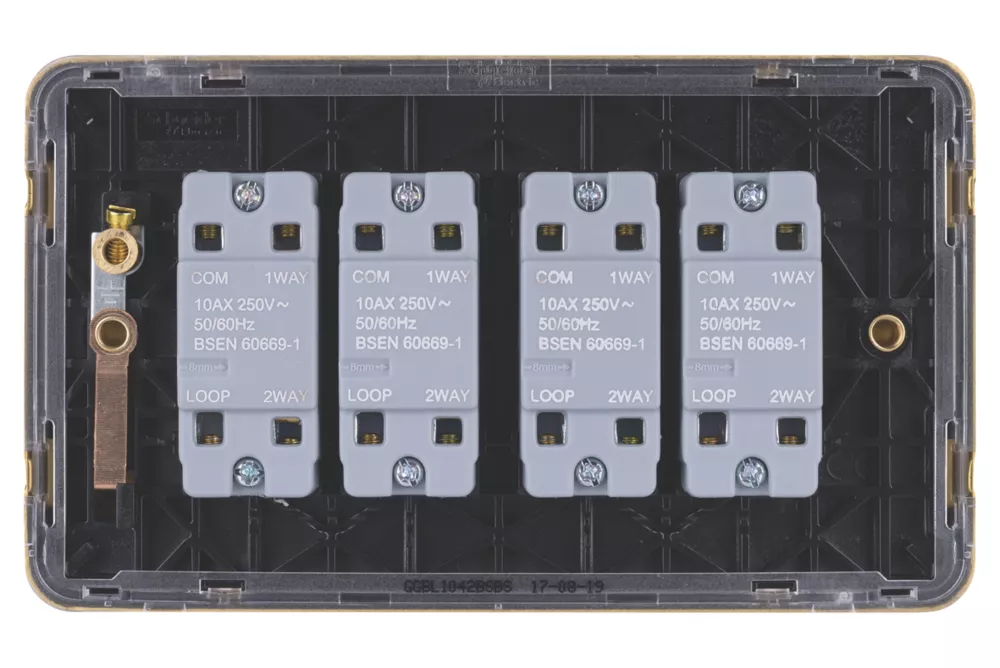 Schneider Electric Lisse Deco 10AX 4-Gang 2-Way Light Switch Satin Brass With Black Inserts