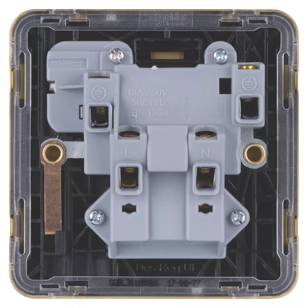 Schneider Electric Lisse Deco 13A 1-Gang SP Switched Plug Socket Satin Brass With Black Inserts
