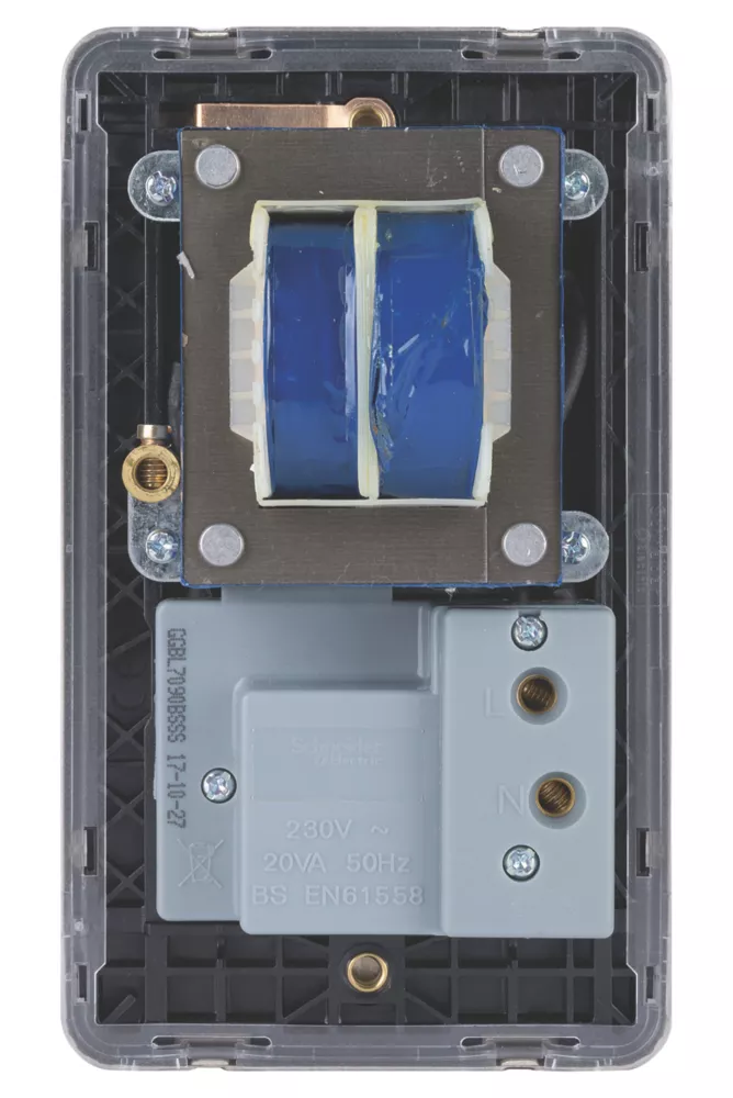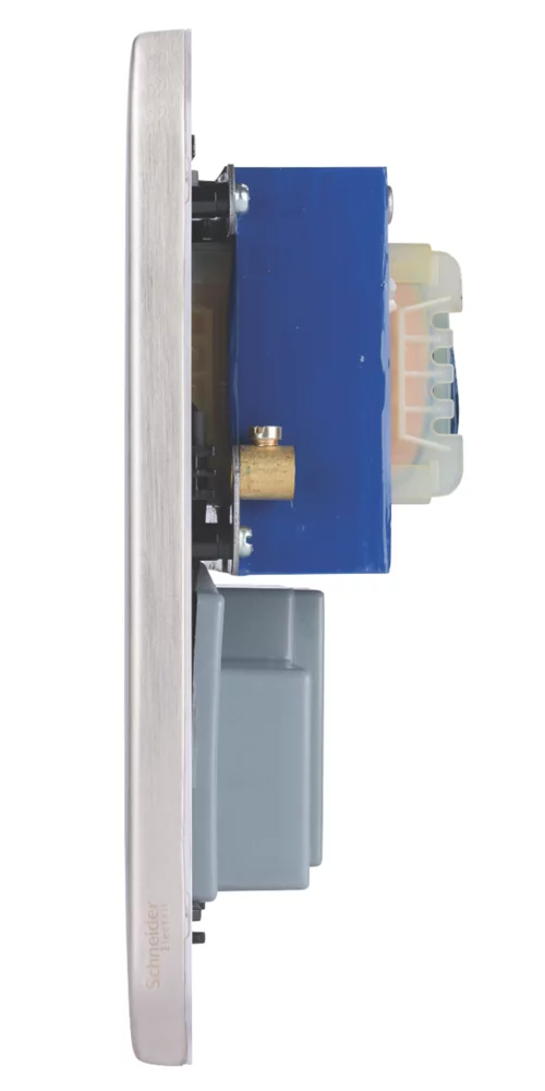Large raised rounded-edge profile with a brushed stainless steel finish. Screwless faceplate with reliable clip-in system. Supplied with light grey back moulding for easier terminal identification. Ideally suited for new construction and refurbishment projects. Easy to install. Concealed fixings.