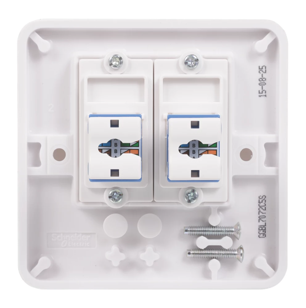 Double RJ45 Cat 5E outlet. Smooth, soft-curved plate profile. Made from durable, high quality urea with antimicrobial properties. Ideally suited for new constructions and refurbishment projects. Supplied with screw cap covers for a sleek finish.