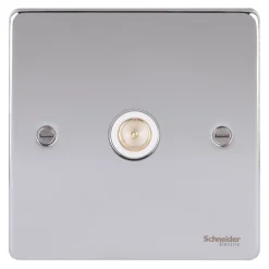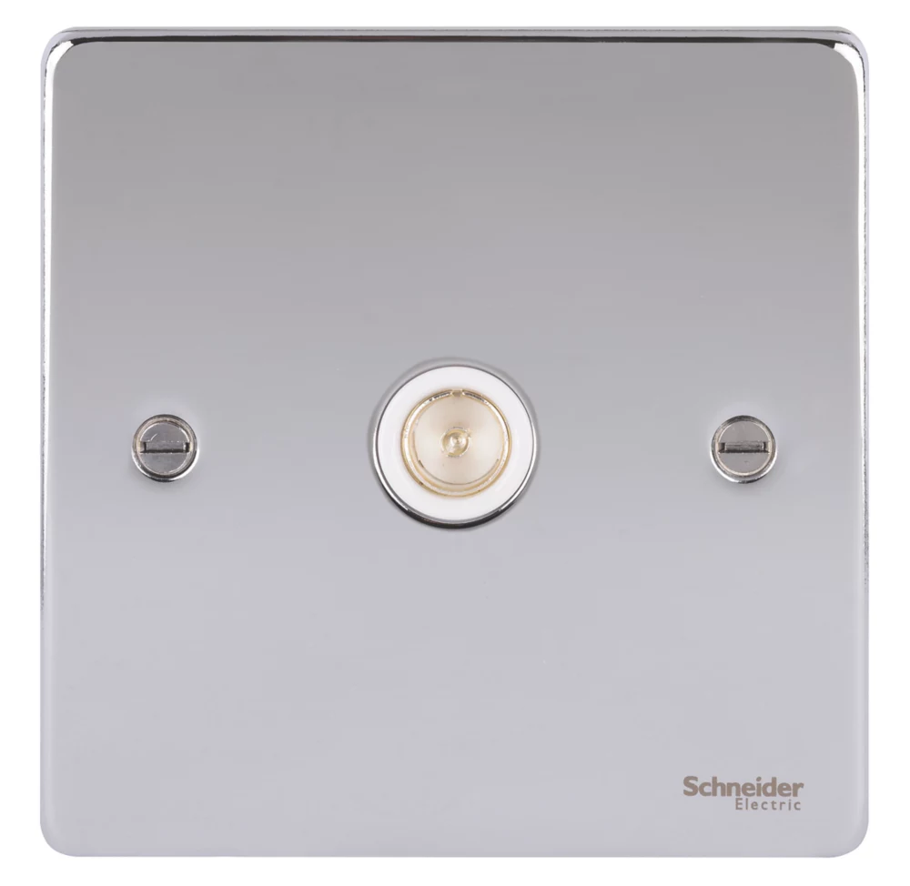 Low profile coaxial socket. Contemporary, soft-curved edge design with polished chrome finish. Colour-matched faceplate screws.