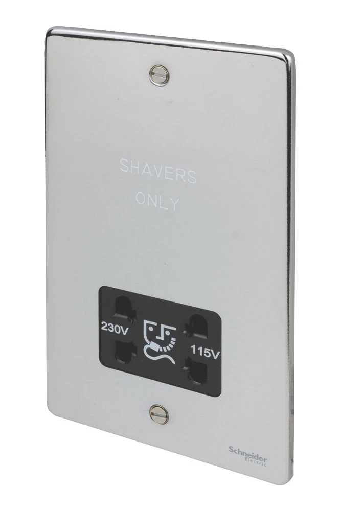 Low profile dual voltage shaver socket with contemporary soft-curved edge. Polished chrome with black inserts.