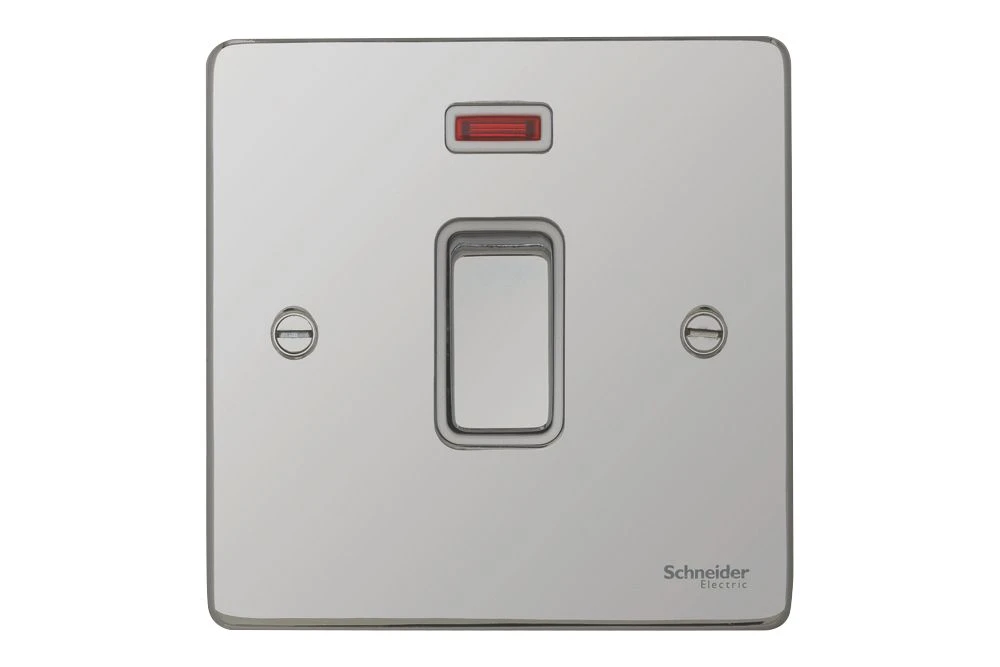 Low profile 20A double pole switch with neon indicator.
