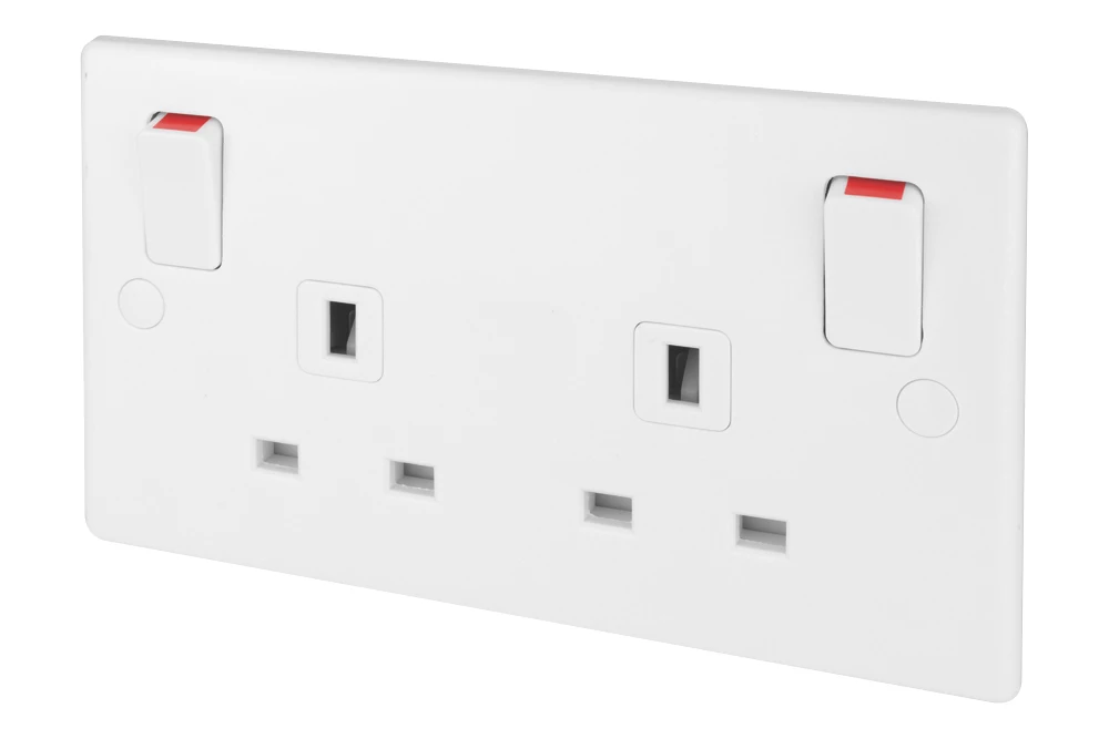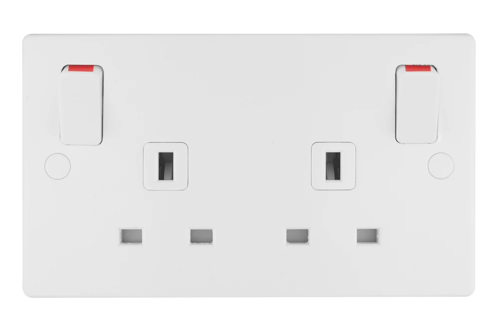 Slimline 2-gang double-pole switched socket with outboard rockers.