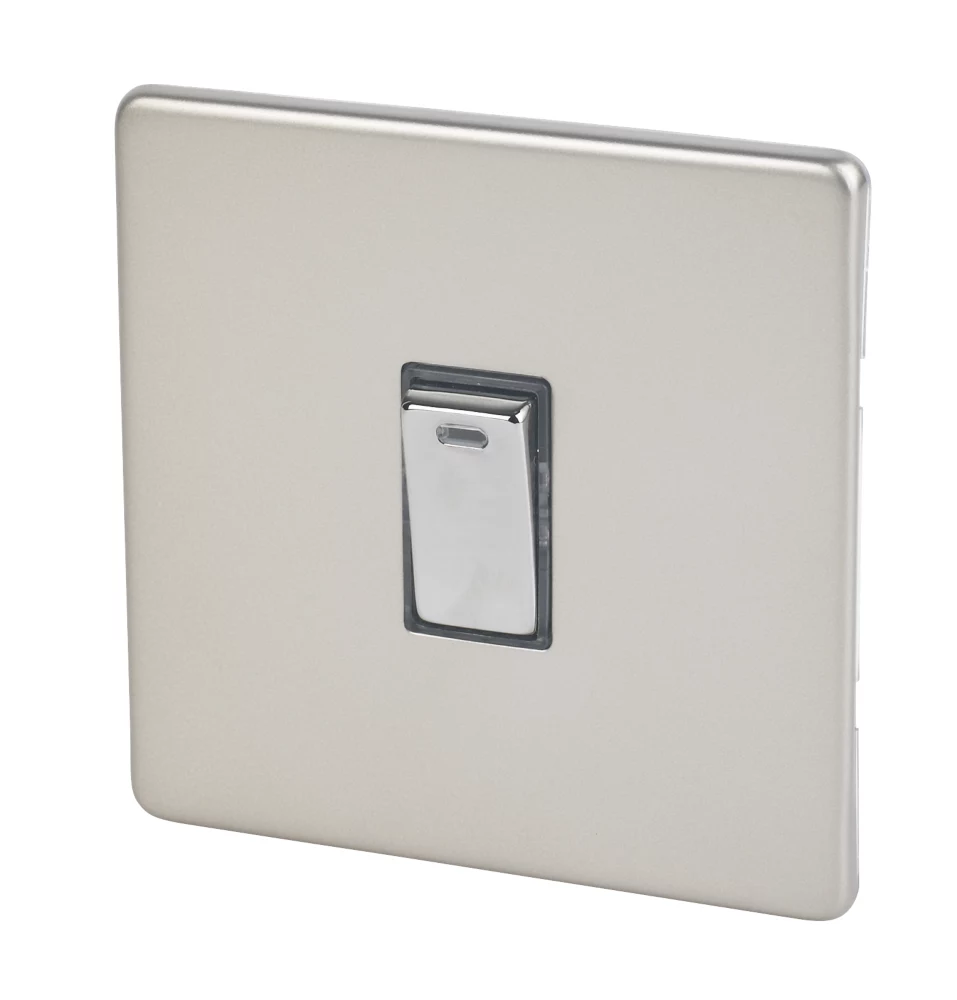 Low profile, interchangeable screwless faceplate for a sleek, contemporary style. Satin chrome finish with polished chrome controls. Includes neon indicator. Concealed fixings.